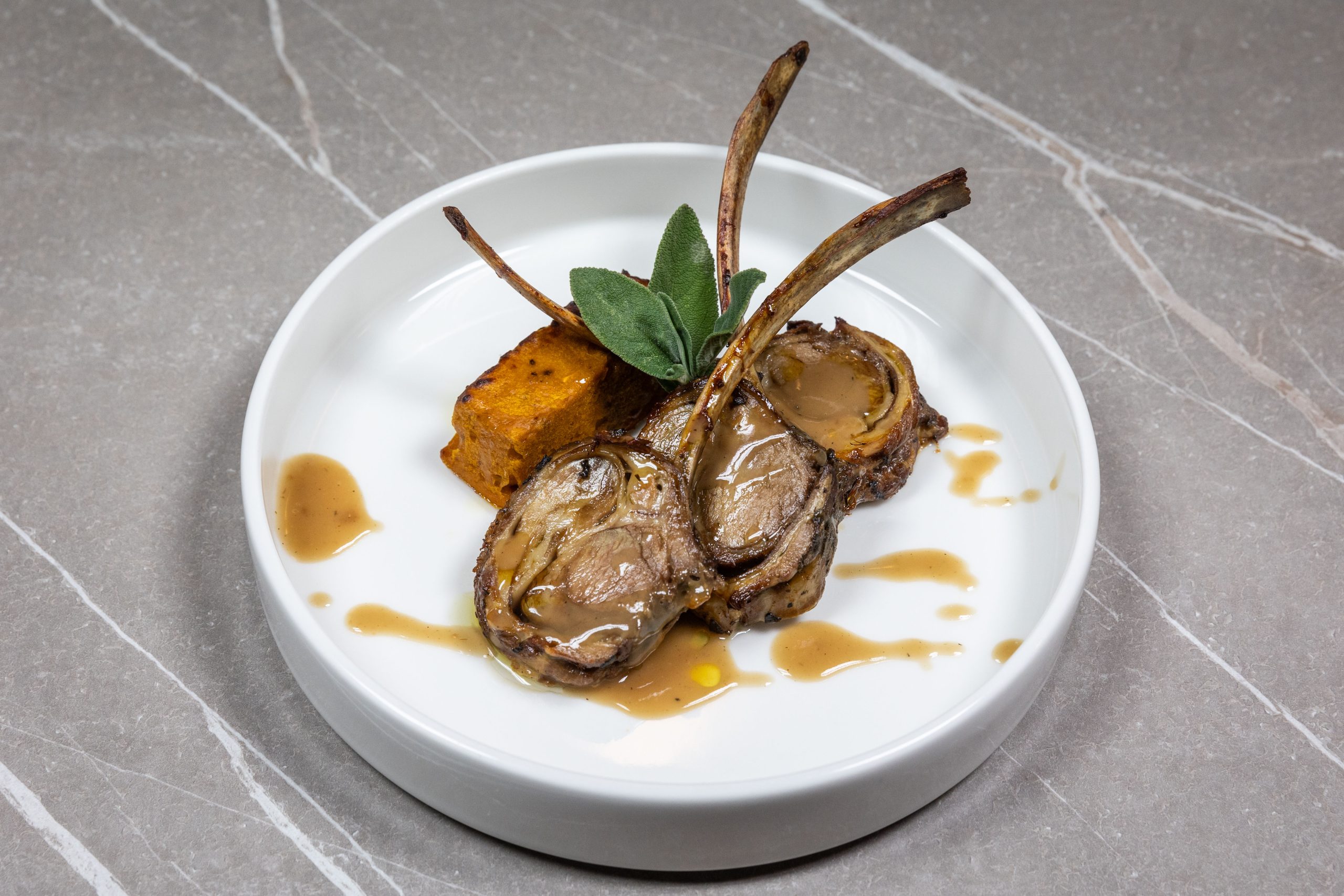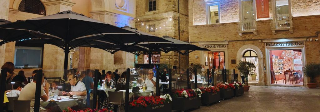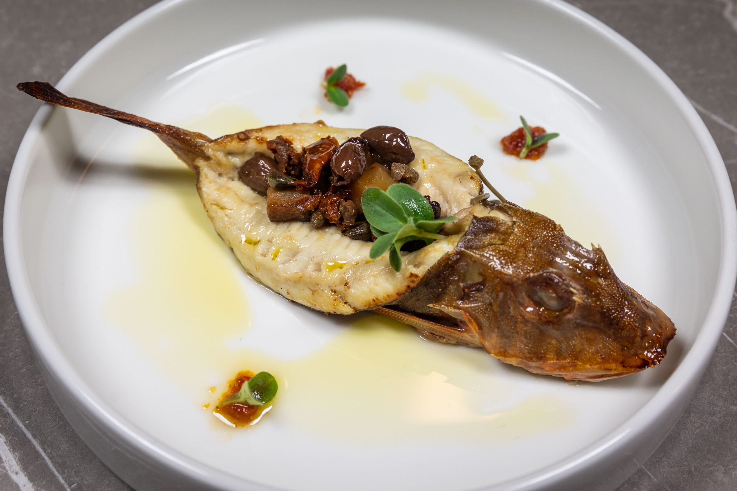 Terrina di coniglio con olio al finocchietto e cotica soffiata, Piccione con riduzione al vino cotto, e pescato dell’Adriatico come la Gallinella in potacchio.